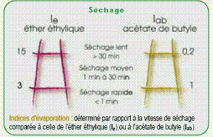 Les indices d’évaporations relatifs à l’éther éthylique (Ie, norme DIN 53170) et à l’acétate de butyle (Iab, normes DIN 53170 et ASTM D 3539) permettent de classer les solvants en trois grandes classes :