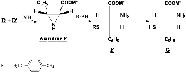 A8. En traitant le mélange D + D’ par l’ammoniac puis en séparant les produits obtenus, on obtient l’aziridine E. Ce composé est alors traité par un thiol pour conduire à F. F est transformé en plusieurs étapes en G, un analogue de la cystéïne.