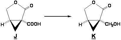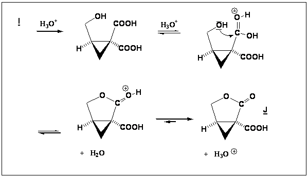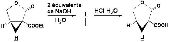 B1. Le composé H est hydrolysé en milieu basique pour conduire à I qui est ensuite converti en J en milieu acide.
