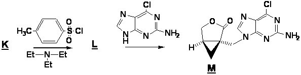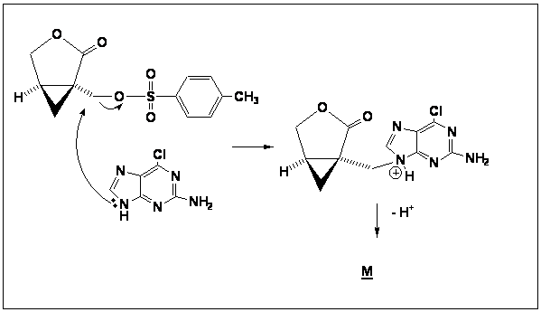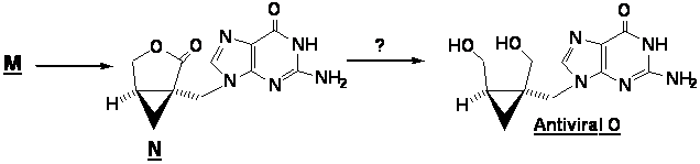 B5. M est alors hydrolysé en N (liaison C-Cl hydrolysée). N est transformé en antiviral O.