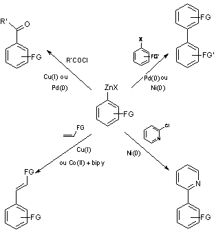 Les organozinciques ainsi obtenus peuvent être couplés avec divers électrophiles en présence d’un catalyseur approprié : par exemple avec la cyclohex-2-énone , avec le chlorure d’allyle, ou avec divers iodés aromatiques. Les rendements obtenus sont de moyens à bons, quel que soit le groupement fonctionnel porté par le noyau aromatique.