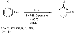 Bien qu’il soit maintenant possible d’obtenir des aryllithiens et des arylmagnésiens fonctionnalisés à partir des iodures aromatiques et parfois des bromures, les réactions mettent en jeu plusieurs étapes et se font à basse , voir très basse températures.