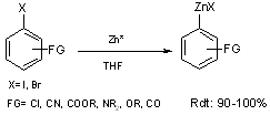 Les iodures aromatiques réagissent rapidement avec le zinc actif à température ambiante, alors qu’avec des bromures aromatiques il faut se placer plusieurs heures à reflux. Par contre, il n’est pas possible de synthétiser le zincique d’un chlorure aromatique.