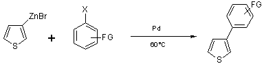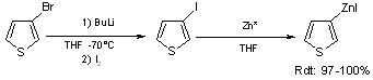 Ce procédé a été étendu à des composés hétéroaromatiques tel que les 2-iodothiophènes ; par exemple le zincique du 2-iodothiophène est obtenu en 1.5 heures à température ambiante avec un rendement de 60%.