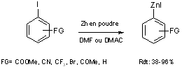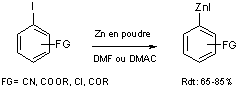 Majid et Knochel (14) ont montré que les iodures porteurs de groupements ester, nitrile, chlorure ou encore cétone, peuvent être converti en organozinciques correspondants par insertion directe du zinc en poudre, activé par réaction avec du dibromoéthane dans la liaison C-I en milieu solvant polaire DMF ou DMAC à des température de l’ordre de 25 à 55°C (équation 7).
