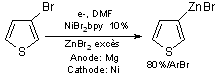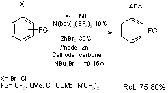 Outre les voies chimiques précédentes des méthodes par electrosynthèse ont aussi été proposées pour conduire aux organozinciques aromatiques à partir des halogénures aromatiques