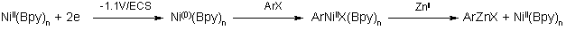 Le procédé électrochimique faisant intervenir des complexes de nickel apporte déjà des améliorations par rapport aux procédés chimiques décrits dans la littérature; d’une part en ce qui concerne la nature des groupes fonctionnels portés par le noyau aromatique, d’autre part car il permet d’utiliser les chlorures aromatiques comme réactif de départ ce qui est complètement original. Le mécanisme de cette réaction met en œuvre le passage par un dérivé s-arylnickel obtenu par réaction entre le nickel zéro valent électrogénéré et l’halogénure aromatique. Le composé s-arylnickel réagit par transmétallation avec les ions zinc présents en solution, et formés par oxydation de l’anode (équation 12)